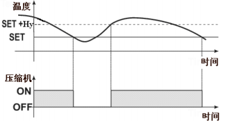 壓縮機輸出的狀態(tài)依據探頭測得的溫度,當溫度大于等于設定點(SET)+ 溫差( Hy)壓縮機輸出觸點閉合,壓縮機運轉;當溫度小于等于設定點(SET)時壓縮機輸出觸點斷開,壓縮機停止運轉。