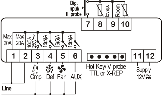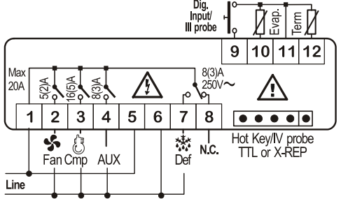XR70CX:外形尺寸 32 x 74 x60 mm為適用于中/低溫強制風冷制冷系統(tǒng)微型溫度控制器,有四路輸出: 一路壓縮機、 一路蒸發(fā)器風扇和一路融霜(電熱或熱氣),還有 一路可以定義用于燈光、報警繼電器輸出、輔助輸出中的一種;提供了內置實時時 鐘,每天最多可以設置6個融霜周期,還可按假日和工作日分開設定。“白天及夜晚”功能可設定兩個不同的設定值從而實現(xiàn)節(jié)能?梢蕴峁┳疃噙_四路NTC或PTC探 頭輸入: 一路為庫溫、一路為蒸發(fā)器溫度( 融霜終止溫度+風扇停止溫度控制),一路 可設置的無源數(shù)字開關量輸入也可以連接第三路溫度探頭輸入(為可選項,需要訂 貨時指明;可通過參數(shù)選擇是否使用);第四路探頭輸入(也可通過參數(shù)選擇是否 使用),連接在5針的熱鍵編程鑰匙接口的2、4號(左數(shù)或右數(shù)都可)端子上(需要 插接轉換器),可以用來測量冷凝溫度報警或者用來顯示某個點的溫度;熱鍵編程 接口可以連接編程鑰匙,還可以連接加裝XJ485-CX通訊轉換模塊接入到兼容ModBUS- RTU協(xié)議的網絡中去,例如DIXELL的XWEB系列監(jiān)控系統(tǒng)。